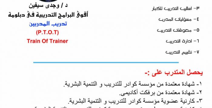 تدريب المدريبن (T.O.T) محاور البرنامج : 1- تعريف التدريب 2- مراحل التدريب و مبادئه 3- اساليب التدريب للكبار 4- مسؤليات المدرب 5 - معوقات التدريب 6- ادراة التدريب 7 - تقييم التدريب يحصل المتدرب علي الشهادات الآتية: شهادة معتمدة من مؤسسة كوادر للتدريب والتنمية الشرية. شهادة معتمدة من وزارة التضامن الأجتماعي. كارنيه عضوية مؤسسة كوادر [...]