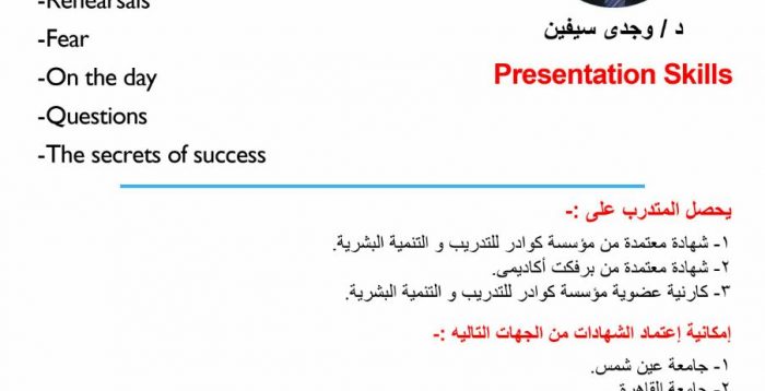 Presentation Skills -Who are the audience - What to use - How to make the slids - Rehearsals - Fear - On the day - Questions - The secrets of success يحصل المتدرب علي الشهادات الآتية: شهادة معتمدة من مؤسسة كوادر للتدريب والتنمية الشرية. شهادة معتمدة من وزارة التضامن الأجتماعي. كارنيه عضوية مؤسسة كوادر بجميع [...]