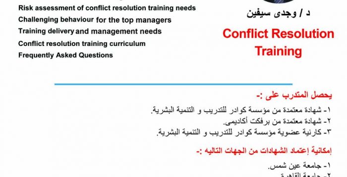 conflict resolution training NHS conflict resolution training risk assessment of conflict resolution training needs challenging behaviour for the top managers training delivery and management needs conflict resolution traning curriculum frequently asked Questions يحصل المتدرب علي الشهادات الآتية: شهادة معتمدة من مؤسسة كوادر للتدريب والتنمية الشرية. شهادة معتمدة من وزارة التضامن الأجتماعي. كارنيه عضوية مؤسسة كوادر [...]