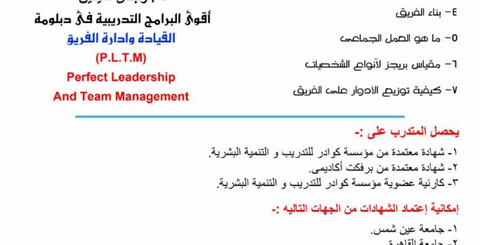 Leadership And Team Management محاور البرنامج : ا - اساليب القيادة 2 - مهارات ادارة الفريق 3- الفرق بين المدير و القائد 4 - بناء الفريق 5- ماهو العمل الجماعي 6 - مقياس بريجز لانواع الشخصيات 7- كيفية توزيع الادوار علي الفريق يحصل المتدرب علي الشهادات الآتية: شهادة معتمدة من مؤسسة كوادر للتدريب والتنمية الشرية. [...]